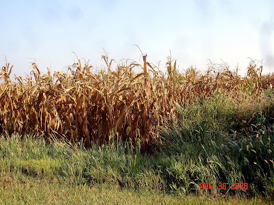 I saw a few houses here and there, but mostly I saw fields. I brought the camera with me, so here's a brief idea of what I mean. There's my bike, and on one side you see a field of drying corn, and on the other a field of soybeans. Corn and soybeans. Those are the principal crops out here, and believe me when I tell you that they are everywhere.